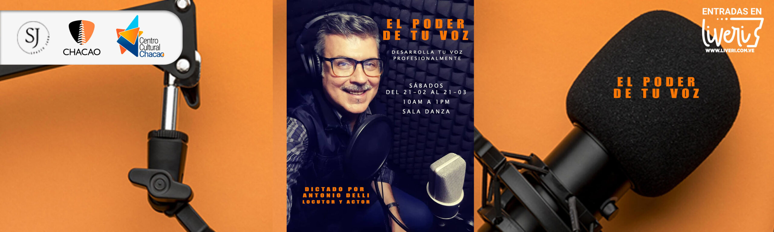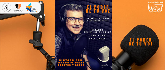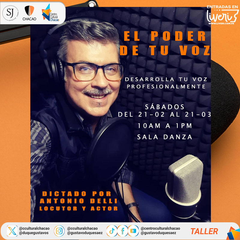El objetivo de este taller es lograr desarrollar tus habilidades comunicacionales mediante técnicas y ejercicios que te permitan conocer e implementar el poder de tu voz. Esta dirigido a aquellas personas interesadas en potenciar su voz para sus actividades profesionales. Este maravilloso taller será dictado por Antonio Delli. Actor, locutor y comunicador social, con 38 años de carrera y experiencia artística en Teatro, Cine, TV, Radio, Doblaje, y Locuciones. Ha sido locutor oficial de promociones para los canales Discovery Kids, Sun Channel, Vale TV, HBO Plus y desde hace 20 años, es locutor oficial de promociones, primero para el canal The History Channel, y actualmente del canal H2, para toda Latinoamérica. En Radio ha trabajado para las emisoras 88.1 FM, Caraota Digital, y actualmente tiene su sección semanal, Acento Delli, a través de Onda la Superestación.