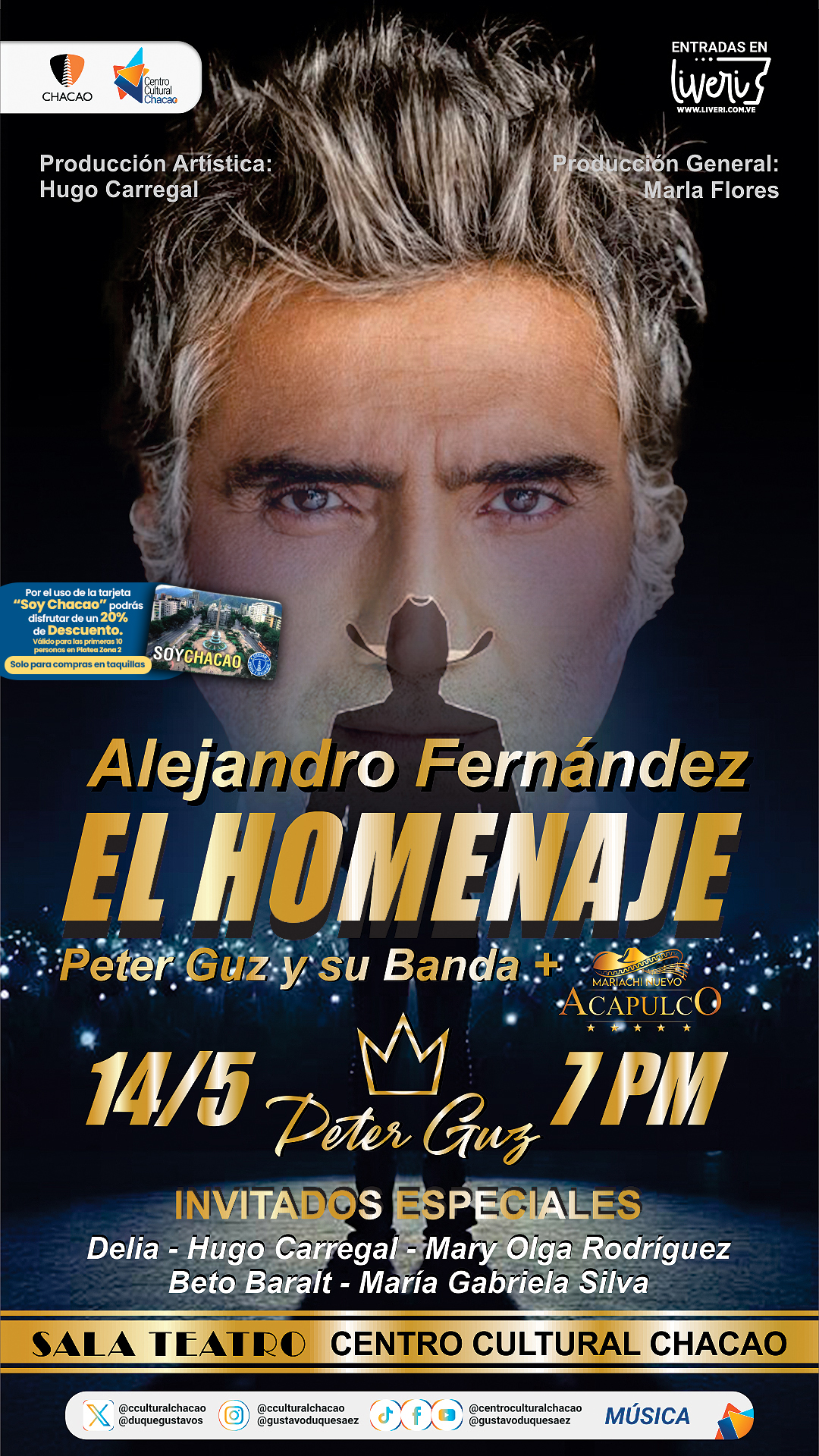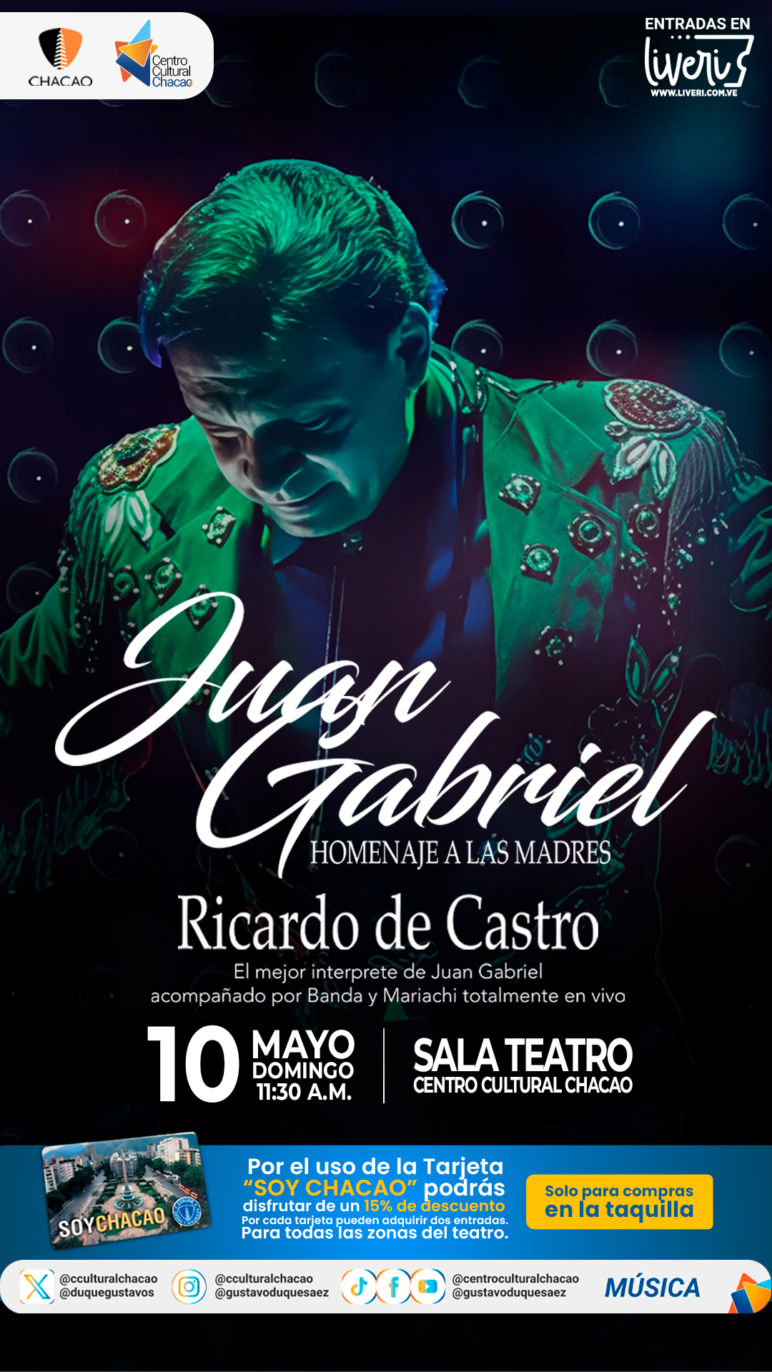 La música de Juan Gabriel, el recordado astro mexicano de la canción, resonará el domingo 10 de mayo, a las 11:30 am, en el teatro del Centro Cultural Chacao, en el espectáculo que el imitador colombiano Ricardo De Castro ofrecerá en esa sala, acompañado de su mariachi y banda. Imitador autorizado por el propio Juan Gabriel en su momento, De Castro ha cosechado buenas críticas en los lugares donde ha ofrecido su show a lo largo de los años en diferentes países de nuestro continente, con el título de Siempre Juan Gabriel. ¡Te esperamos! No te lo pierdas.