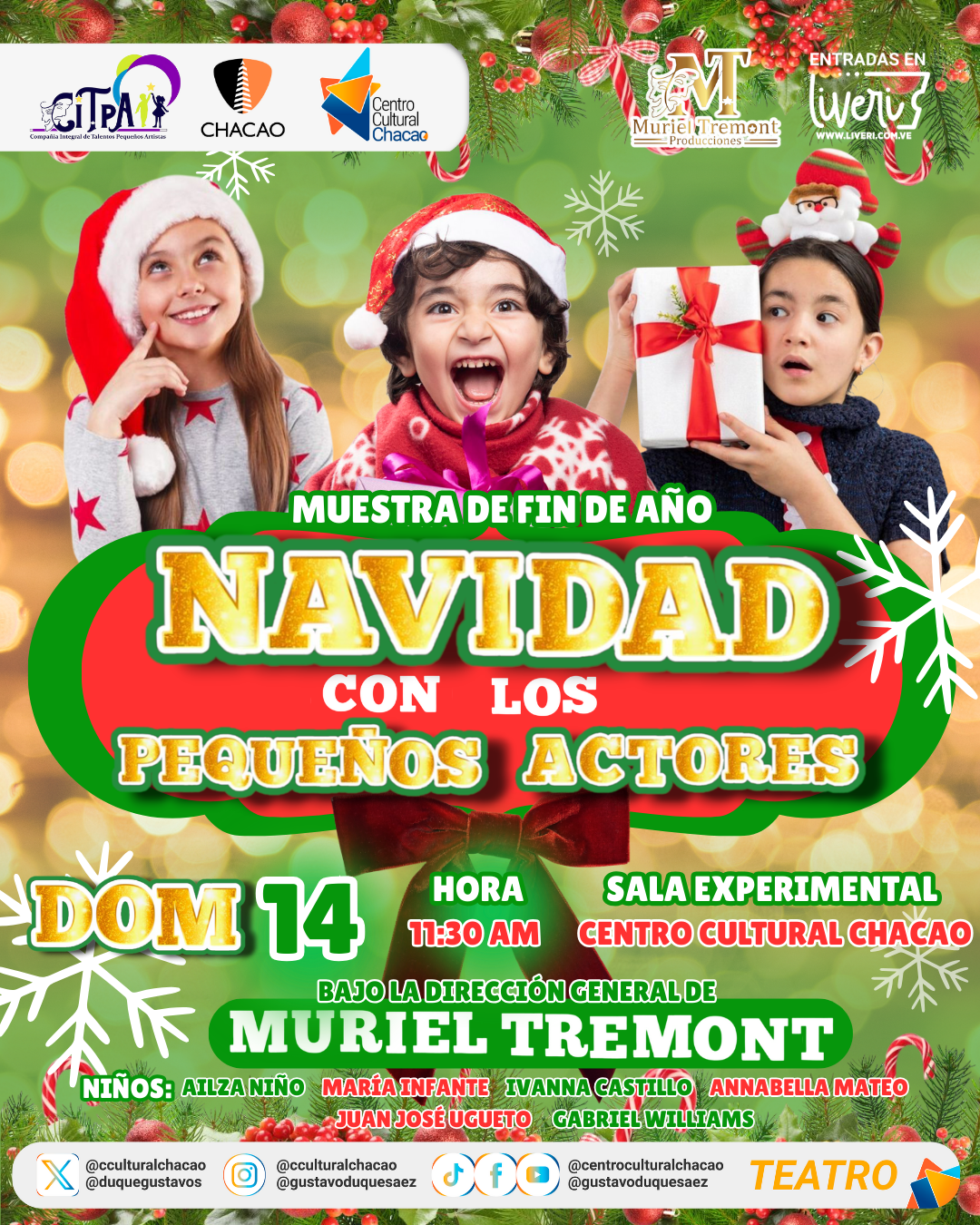 El Centro Cultural Chacao se viste de fiesta para recibir la temporada decembrina con el emotivo montaje «Navidad con Los Pequeños Actores». Seis talentosos niños se subirán al escenario para ofrecer al público un conmovedor viaje a través de las tradiciones navideñas venezolanas de antaño.