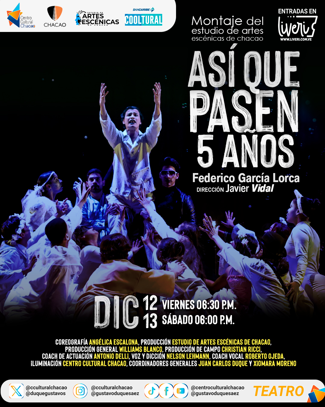 La trágica y surrealista obra “Así que pasen 5 años” de Federico García Lorca, llega a las tablas del Centro Cultural Chacao el 12 y 13 de diciembre, bajo la dirección de Javier Vidal, encarnada por los actores del Estudio de Artes Escénicas de Chacao. Es una pieza teatral entrañable y lírica que te mantendrá al borde de tu asiento de principio a fin, abordando desde el amor frustrado e idealizado hasta el miedo a morir.