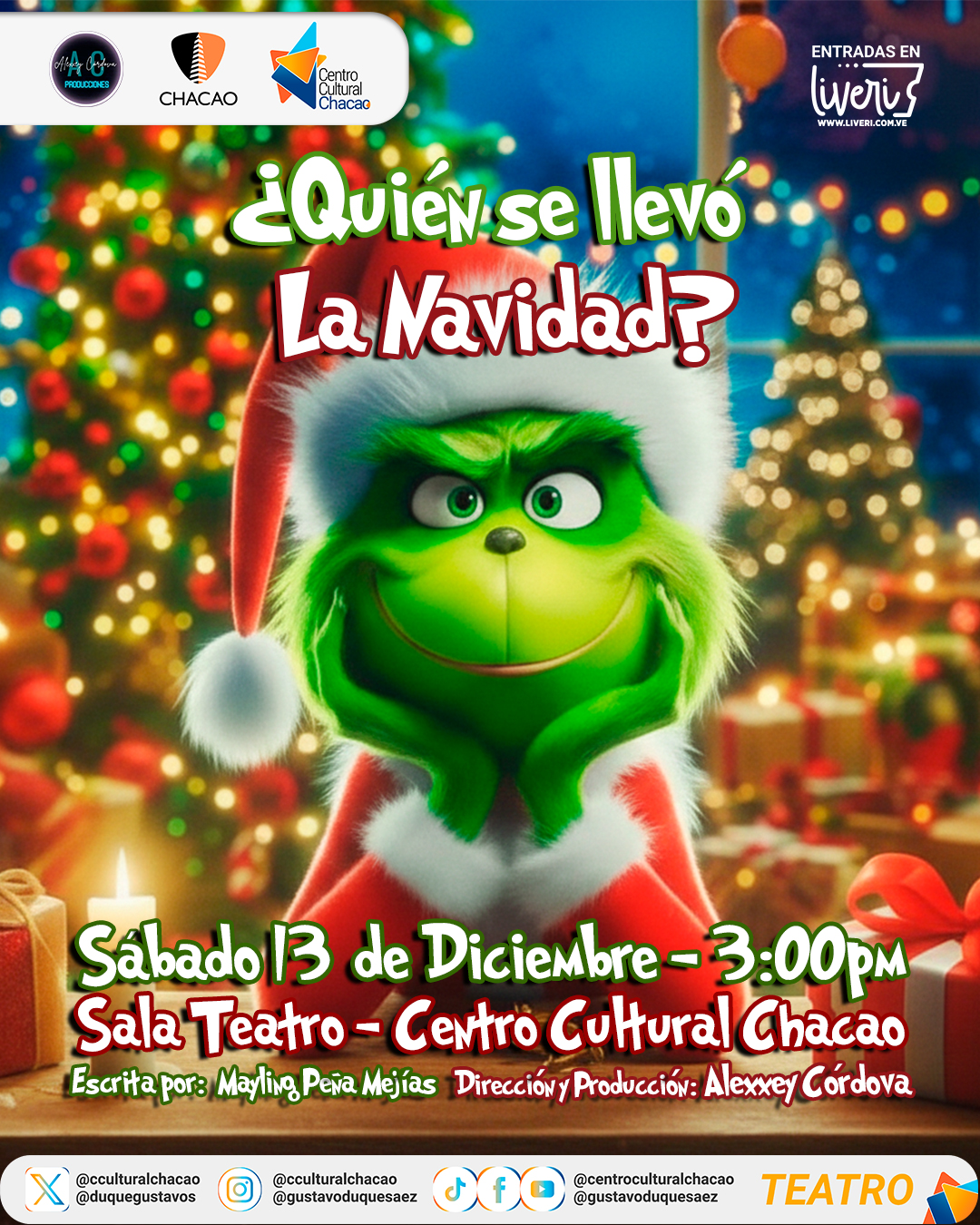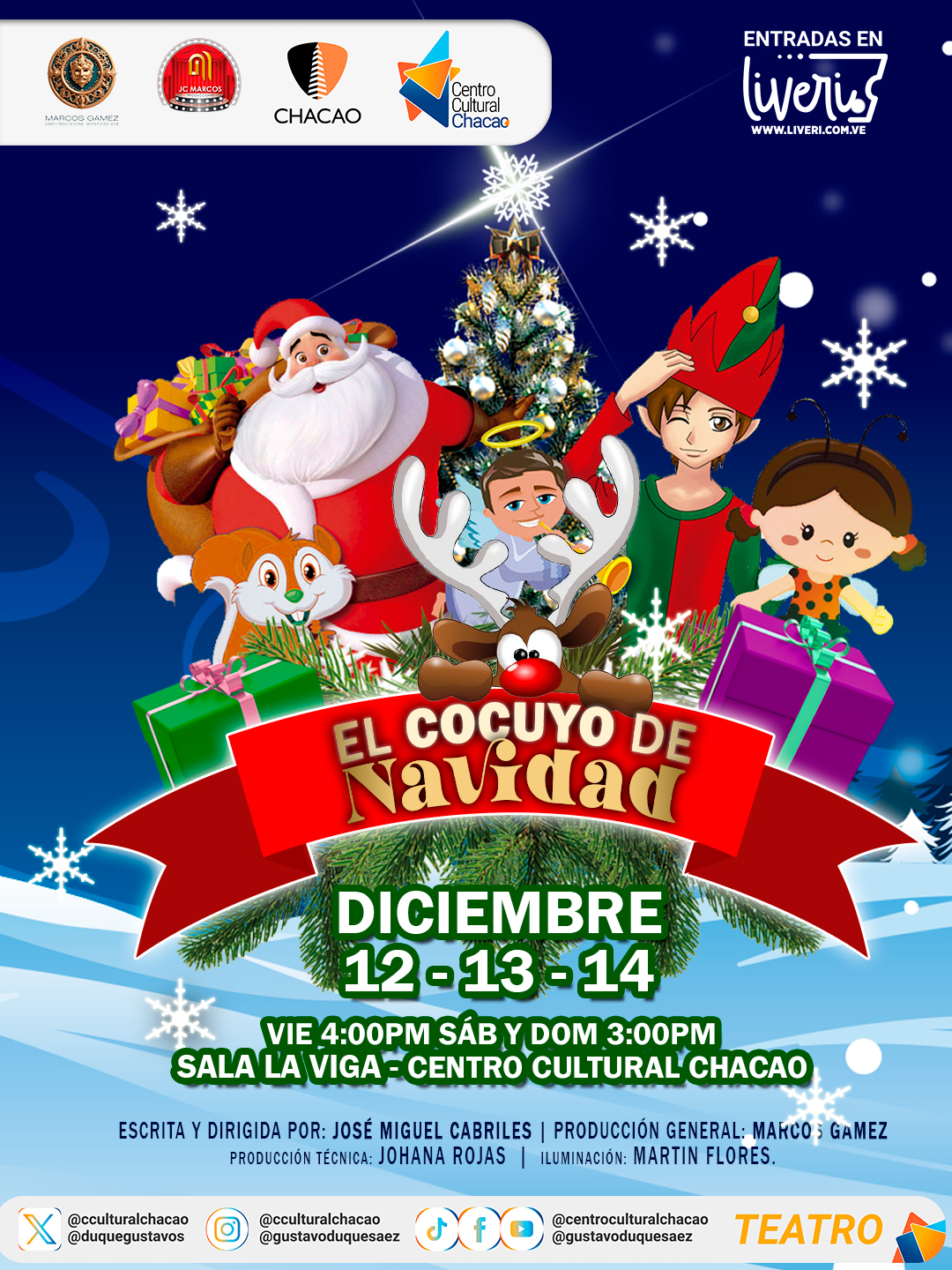 Esta pieza teatral es un homenaje a las costumbres que llenan de magia los hogares durante el mes de diciembre. El público podrá adentrarse en ese tiempo de dulce de lechosa, hallacas, pan de jamón y la ilusión de la Carta al Niño Jesús, reviviendo una experiencia llena de nostalgia que conecta con la esencia de la Navidad.