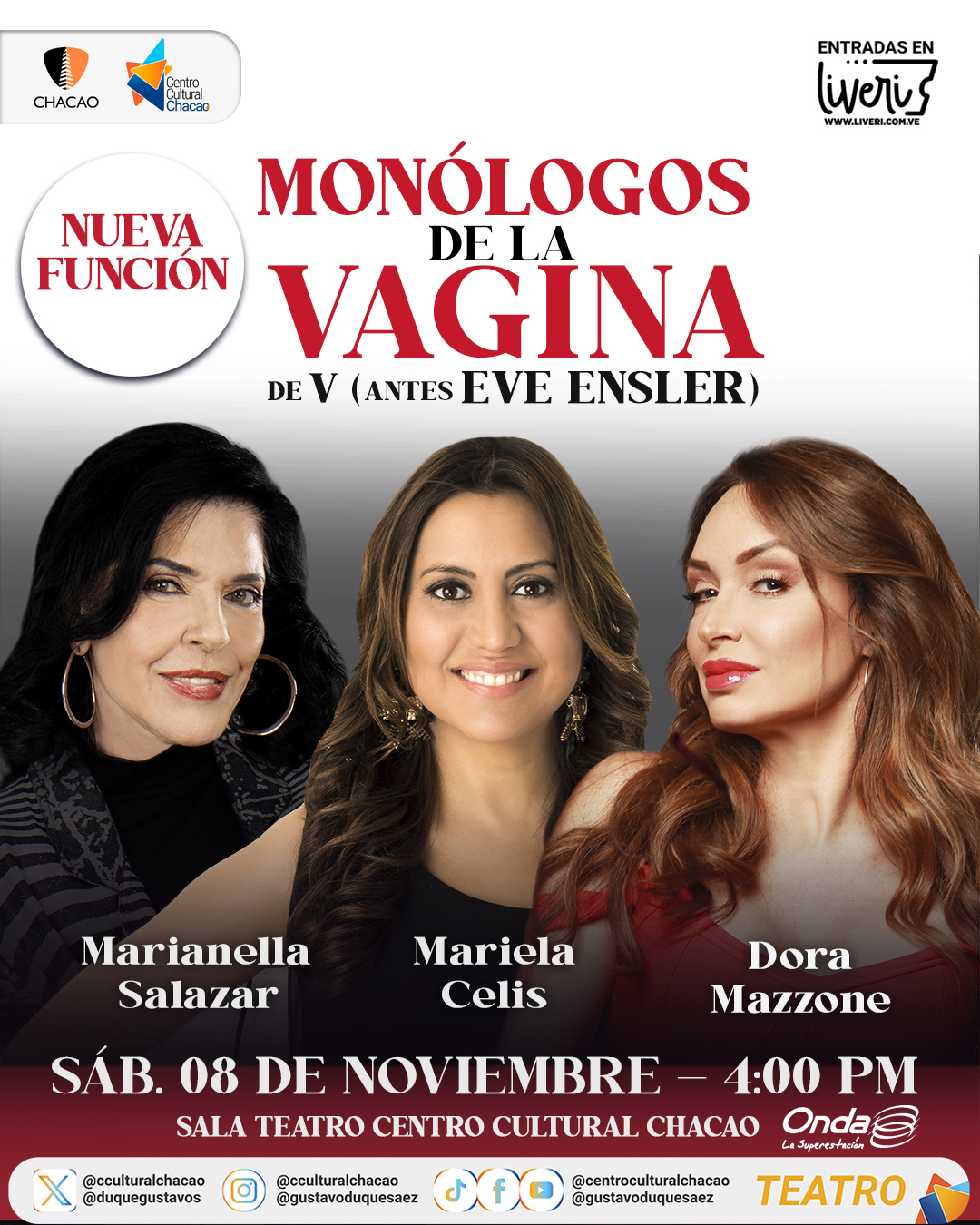 El Centro Cultural Chacao se complace en anunciar la presentación de la aclamada obra teatral «Monólogos de la Vagina», de la escritora y activista estadounidense Eve Ensler. La pieza, producida por Carolina Rincón, bajo la dirección de Héctor Manrique, se presentará en la Sala Teatro el sábado 08 de noviembre a las 4:00 p.m.