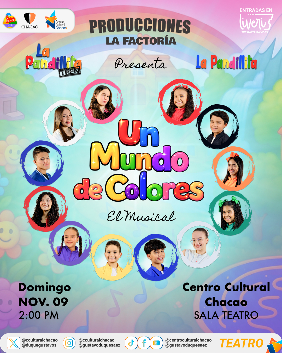 «UN MUNDO DE COLORES» es un musical familiar vibrante, cargado de emociones y mensajes inspiradores que invitan a toda la familia a creer en la magia que llevamos dentro. Un espectáculo para cantar, bailar y recordar que todos, sin importar la edad, tenemos un color especial que hace brillar nuestro mundo.