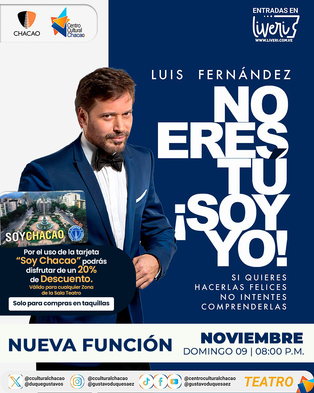 ¿Qué quieren las mujeres? ¿Cómo comprenderlas? ¿Cómo hacerlas felices? Son algunas de las preguntas que intentará responder Luis Fernández este viernes 12 de abril a las 09:00 p.m. en nuestro escenario con su exitoso Stand Up “No eres tú, soy yo”, un repaso por las relaciones de pareja. Las entradas van desde los $10 hasta los $30 y se pueden adquirir a través de liveri.com.ve o en las taquillas del Centro Cultural Chacao.