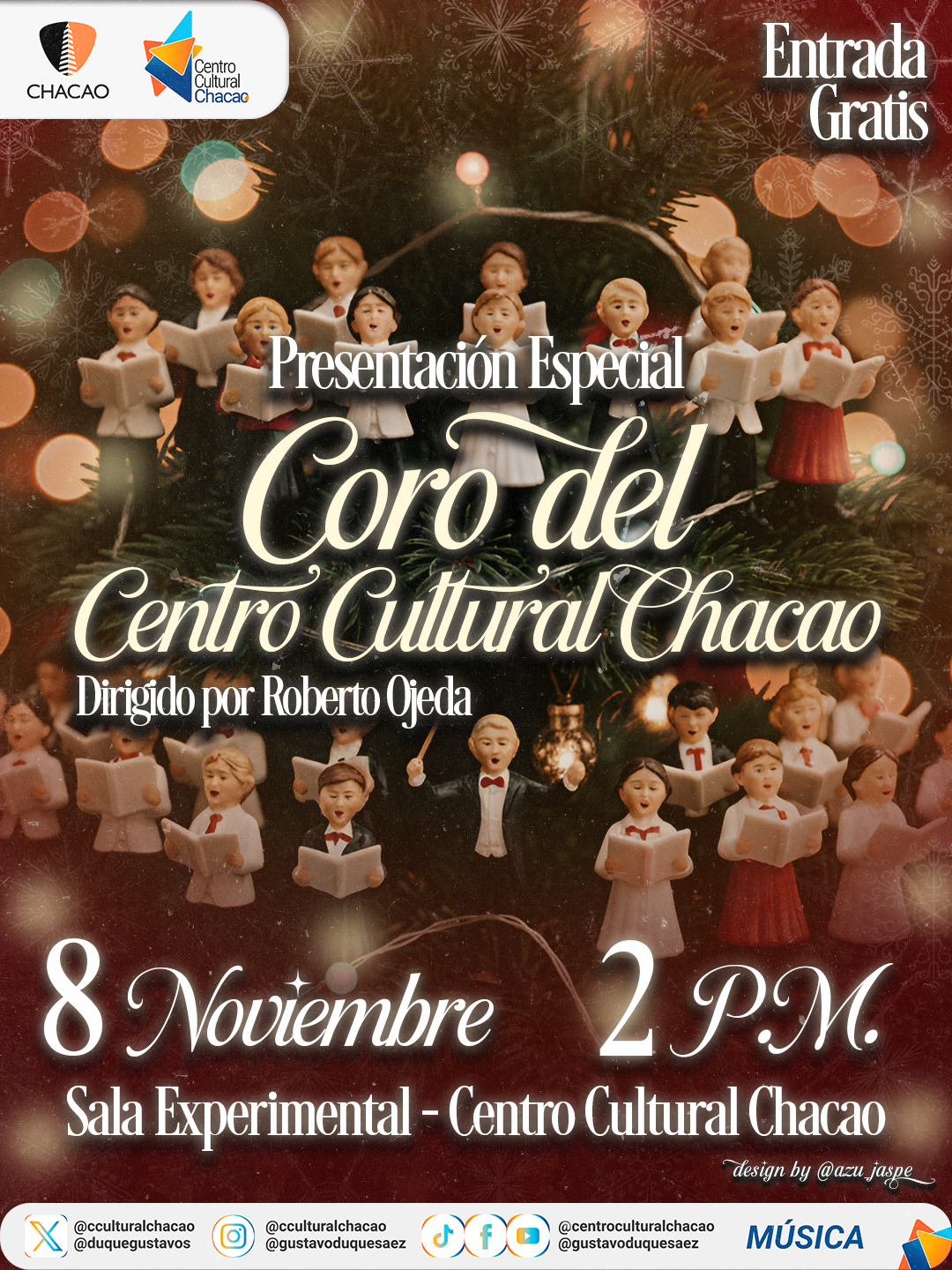 El Coro CCCH, integrado por miembros de la gran familia de trabajadores del Centro Cultural Chacao, se une para regalarle al público una presentación llena de calidez y sentimiento. Ven a disfrutar de un emotivo repertorio de aguinaldos criollos, que nos llenará del espíritu navideño y nos recordará el valor de nuestras raíces musicales.