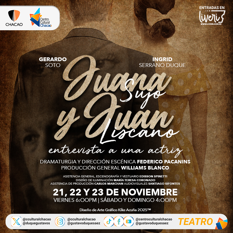 JUANA Y JUAN – SUJO Y LISCANO: Entrevista a una actriz Deleita en el Centro Cultural Chacao Luego de una exitosa temporada en la Sala Cabrujas regresa a las tablas en el Centro Cultural Chacao, en la sala La Viga, la pieza “Juana y Juan – Sujo y Liscano”. La obra es un diálogo en un acto en el que Juan […]