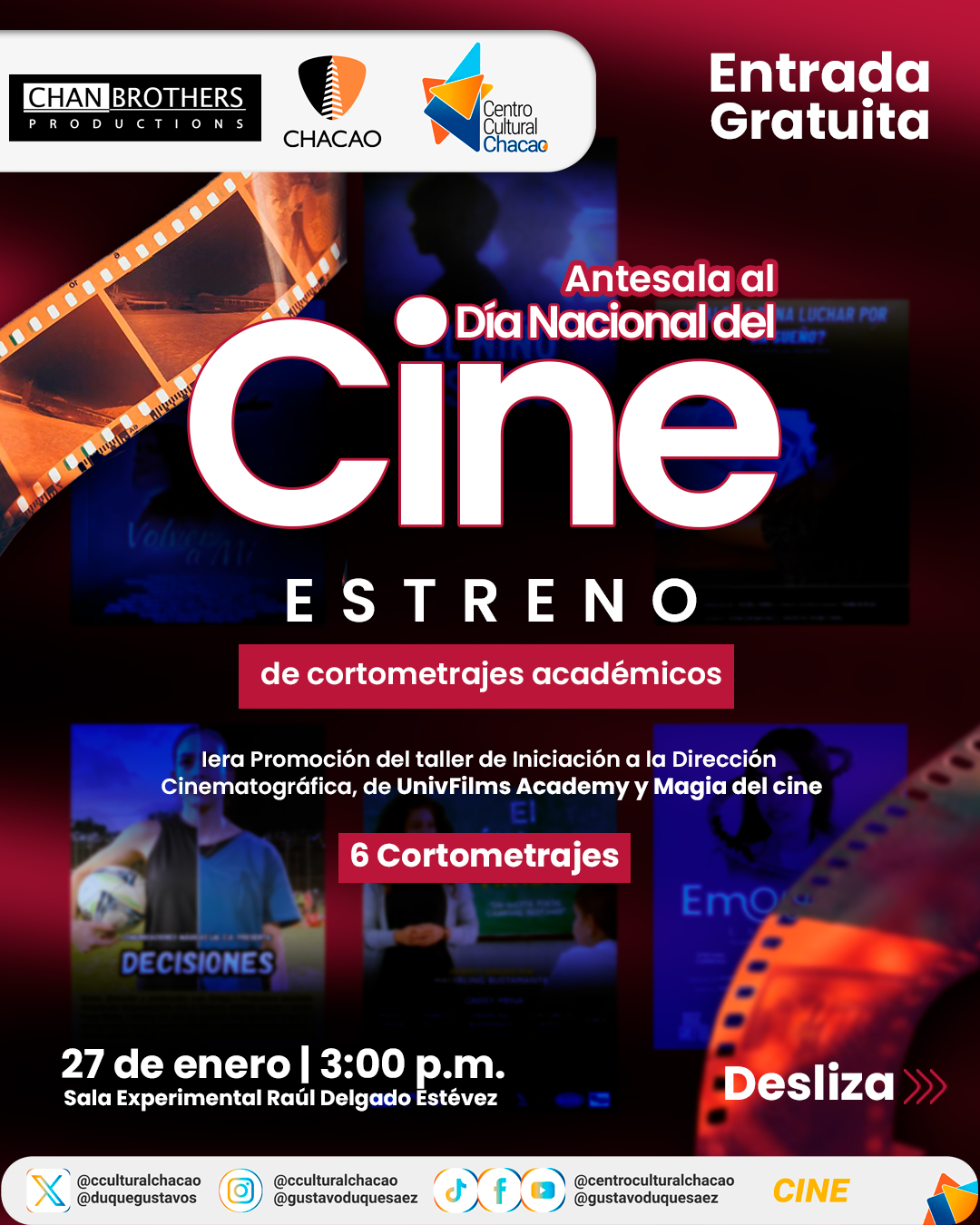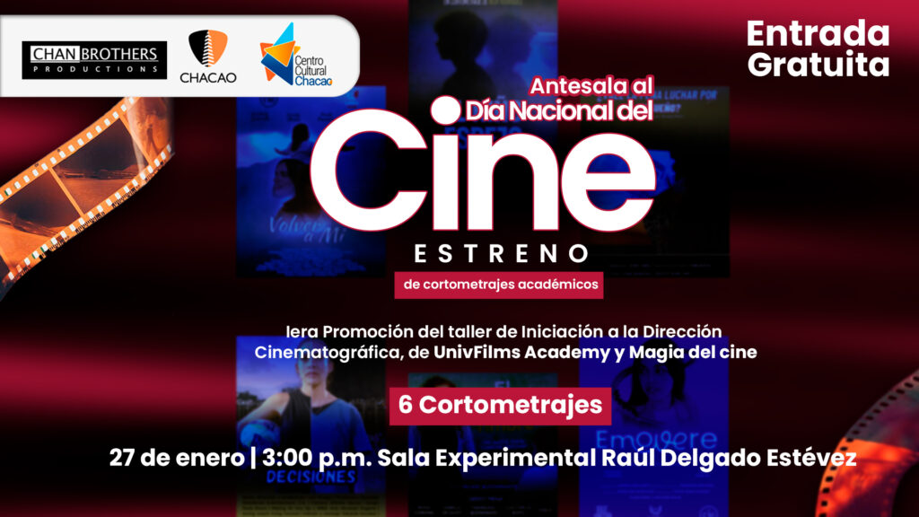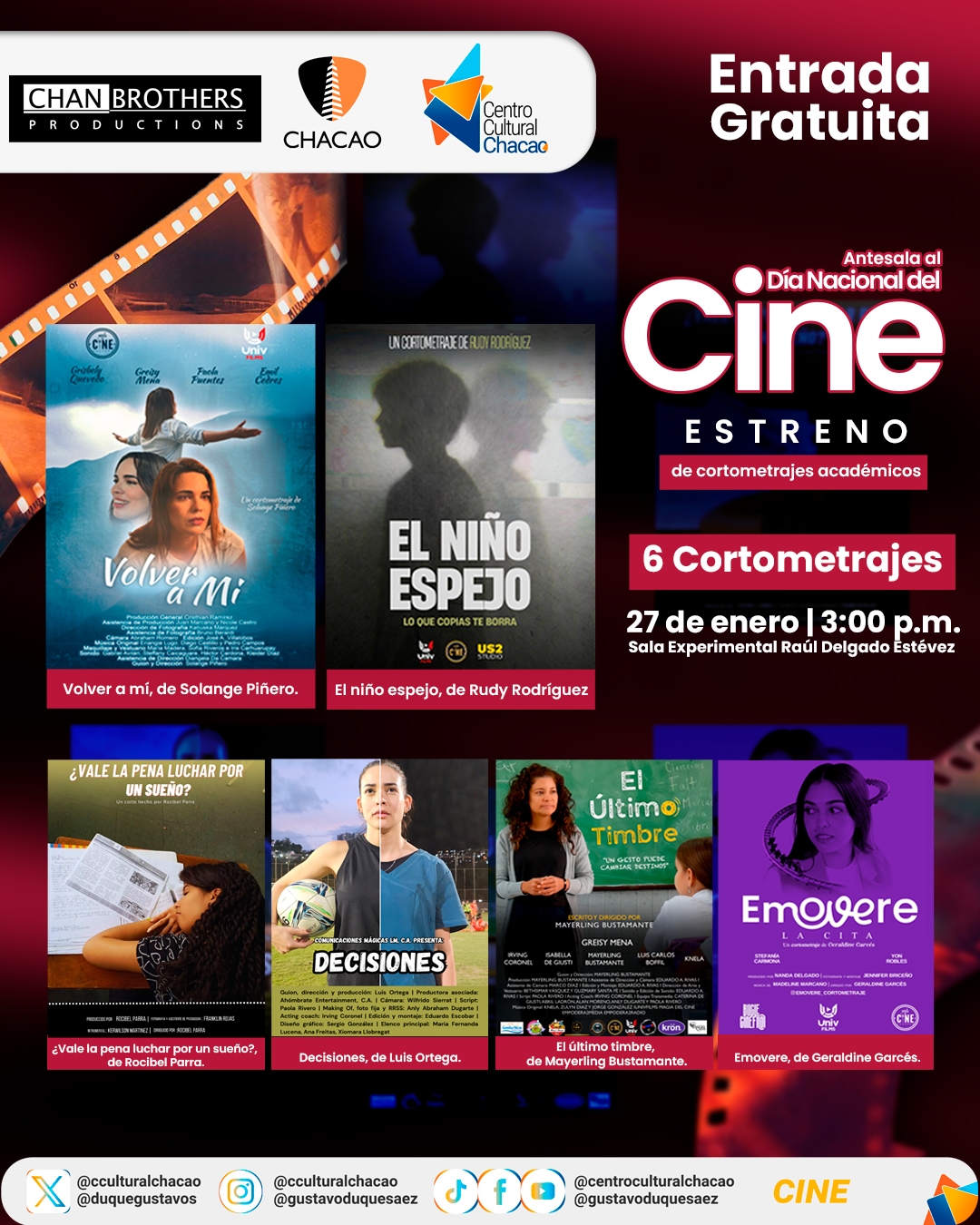 Caracas, enero de 2026 — En el marco de la antesala del Día del Cine Nacional, Chan Brothers Productions, Magia del Cine y el Centro Cultural Chacao tienen el honor de invitar a la muestra de cortometrajes de la I Promoción del taller de «Iniciación a la Dirección Cinematográfica», avalado por Univf Films Academy. Esta selección surge de un profundo respeto por la educación de calidad como eje de transformación social, rindiendo tributo a los movimientos que han definido el séptimo arte. El encuentro se llevará a cabo el próximo martes 27 de enero de 2026, a las 03:00 p. m., en la Sala Experimental del Centro Cultural Chacao.