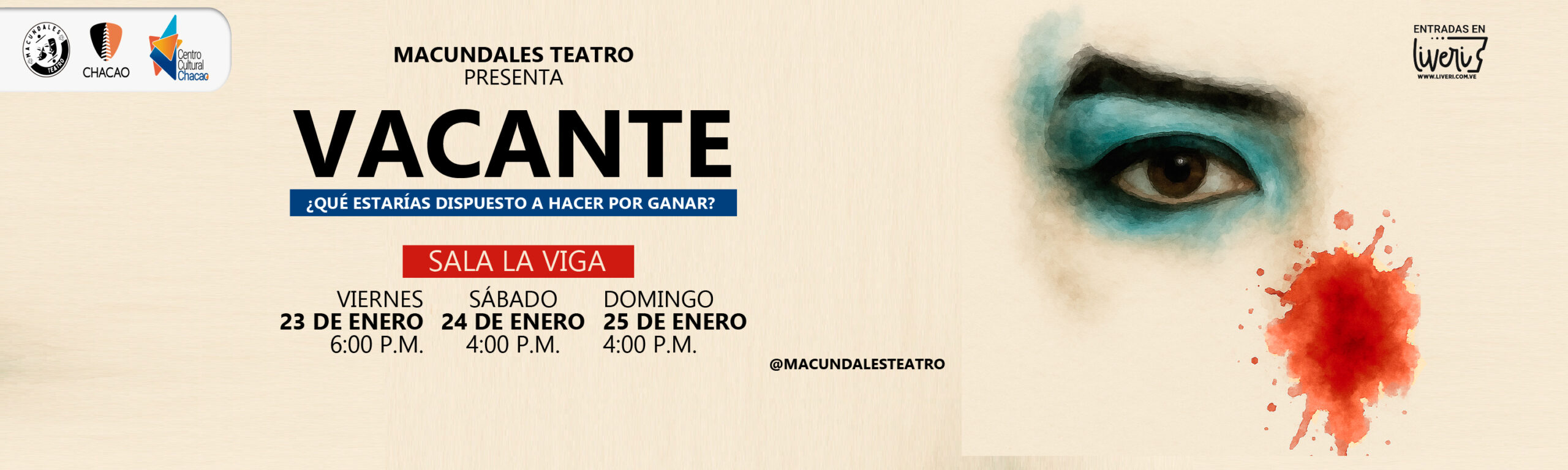 Vacante es una producción de @macundalesteatro que nos propone una puesta en escena experimental e interactiva en donde el público se convierte en testigo, o cómplice, de un juego siniestro en donde la ambición, la arrogancia, la violencia, el ego y la desesperación impulsan a los personajes a conseguir sus objetivos a toda costa.
