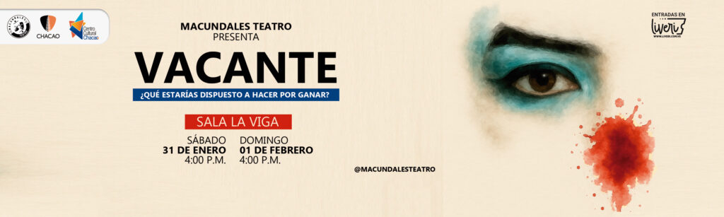 Vacante es una producción de @macundalesteatro que nos propone una puesta en escena experimental e interactiva en donde el público se convierte en testigo, o cómplice, de un juego siniestro en donde la ambición, la arrogancia, la violencia, el ego y la desesperación impulsan a los personajes a conseguir sus objetivos a toda costa.